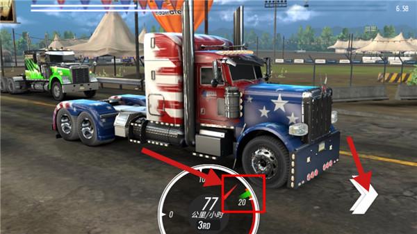1、进入游戏点击右边踏板,待指针停在绿色区域起步,开启新手引导,踏上巨型卡车竞速的精彩旅程。