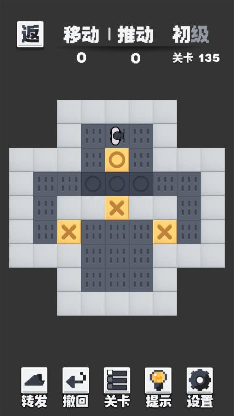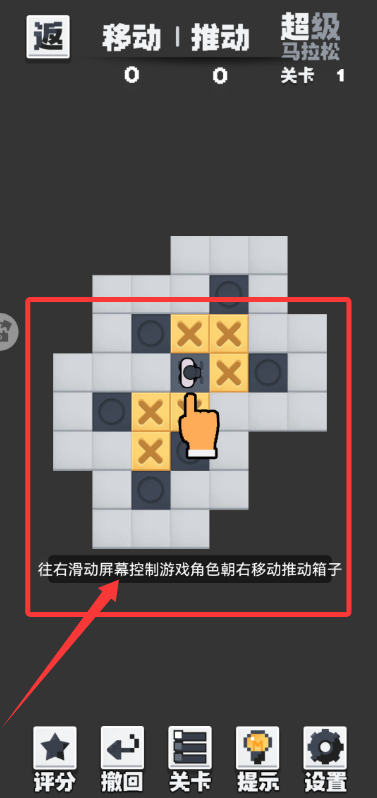 2、进入关卡中,按提示滑动屏幕控制角色移动,把箱子推到带“×”标记的目标位置。