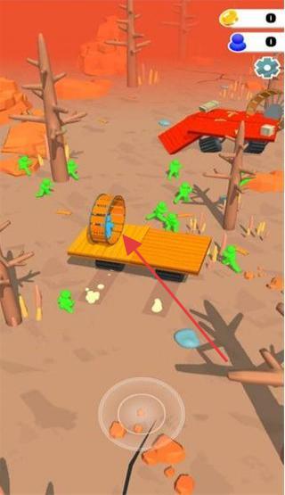 2、引导蓝色角色推动【木桶】,利用其撞击绿色敌人,清理路径障碍。