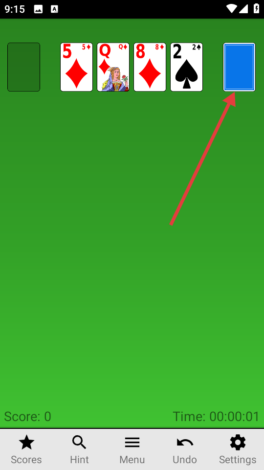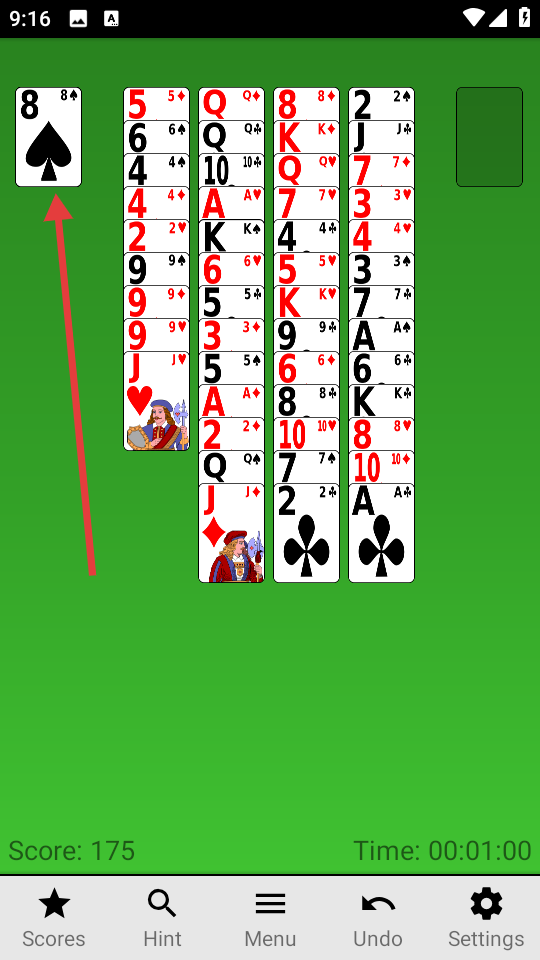 2、点击牌堆补充新牌,把四组花色整理到右上角算胜利。