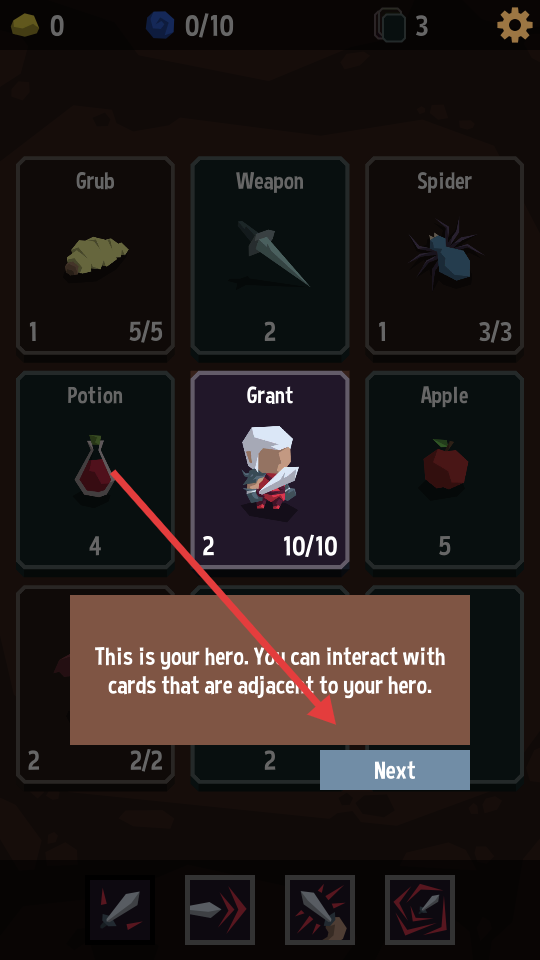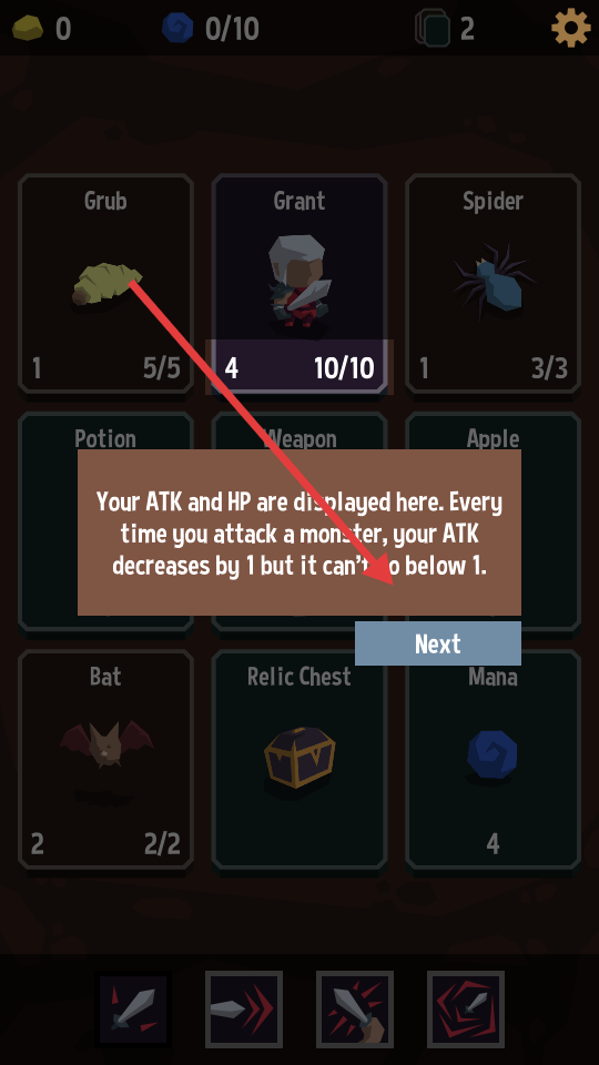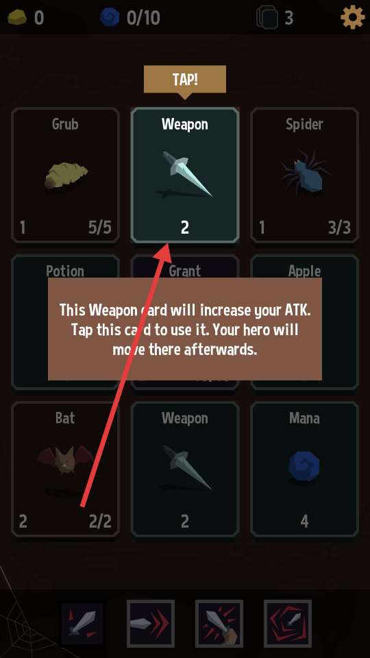 1、戳戳武器卡牌涨攻击力,摸摸血瓶回血条,但别乱点怪物卡除非想被反杀。