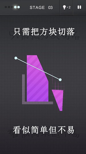 1、指尖精准切割操作实践:通过在屏幕上滑动划出切割线,利用重力作用使方块坠落,需精准把握切割角度与力度,超过80%的方块顺利掉落以完成关卡。