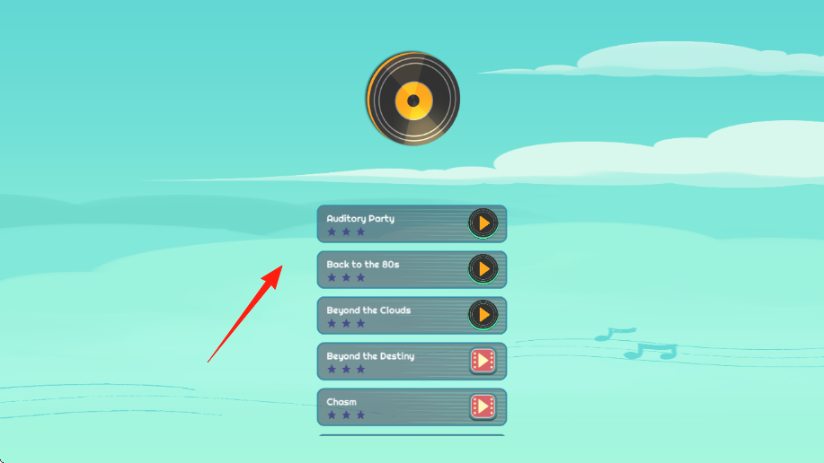 1、音乐选择AuditoryParty”“Backtothe80s”等曲目,播放唱片图标,进入对应节奏关卡。