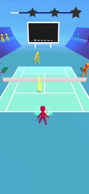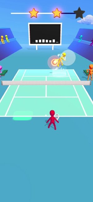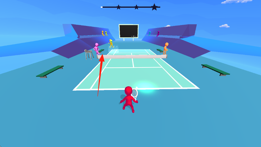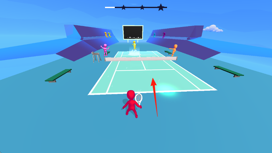 2、网球对战彩色火柴人在网球场地,红角色持拍,按音乐节奏,瞄准对手(黄粉橙)击球,界面有节奏星条。