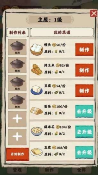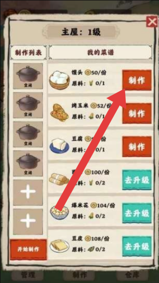 1、呈现的是主屋1级时的制作界面,可制作馒头、烤玉米、豆腐等食物,涉及食材消耗与制作操作,属于模拟经营、料理制作玩法的一部分,玩家可在此进行烹饪生产。