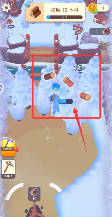 3、依据提示到达树木区域,用工具砍伐收集木材资源,达成收集目标。