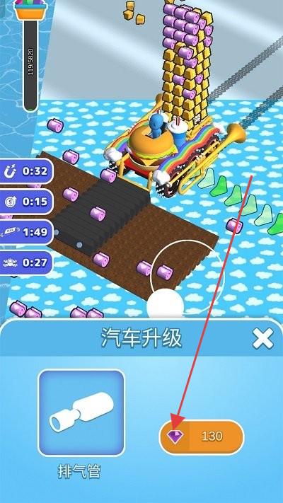 2、做“汽车部件升”!攒够130钻石,点“排气管”升级,2步确认,完成后移速+20%,超赚,解锁新改装(轮胎/外观)。