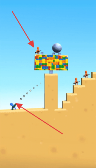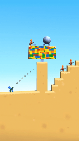 2、控制角色移动,利用抛物线弹道,发射弹药摧毁积木障碍,打击高处敌人。