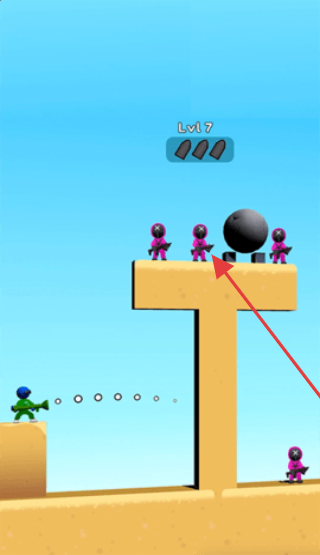 3、把握射击时机,让绿色角色发射弹药,借助场景中的大球,砸落紫色敌人。
