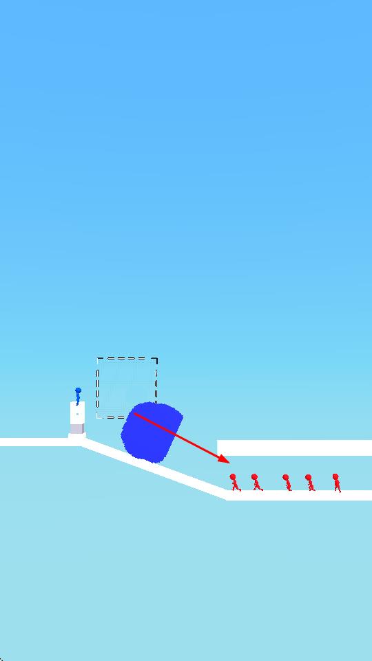 2、建造掩体时,可让巨石滚落,借助斜坡物理特性,撞击、消灭路径上的红色小人,减少威胁。