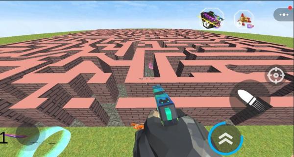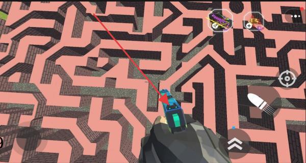 3、面对迷宫围墙,按红色指引,点击武器图标射击,打破障碍,继续探索。