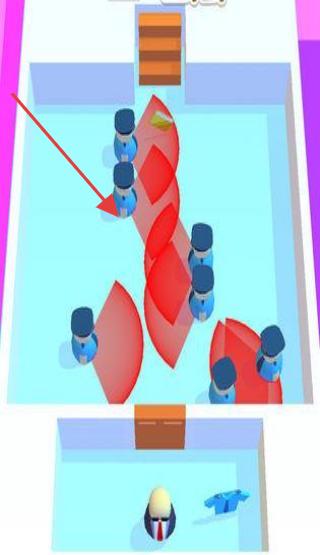 2、遇到蓝色制服人员,观察其红色视野范围,绕开或找掩体躲避,避免被发现。