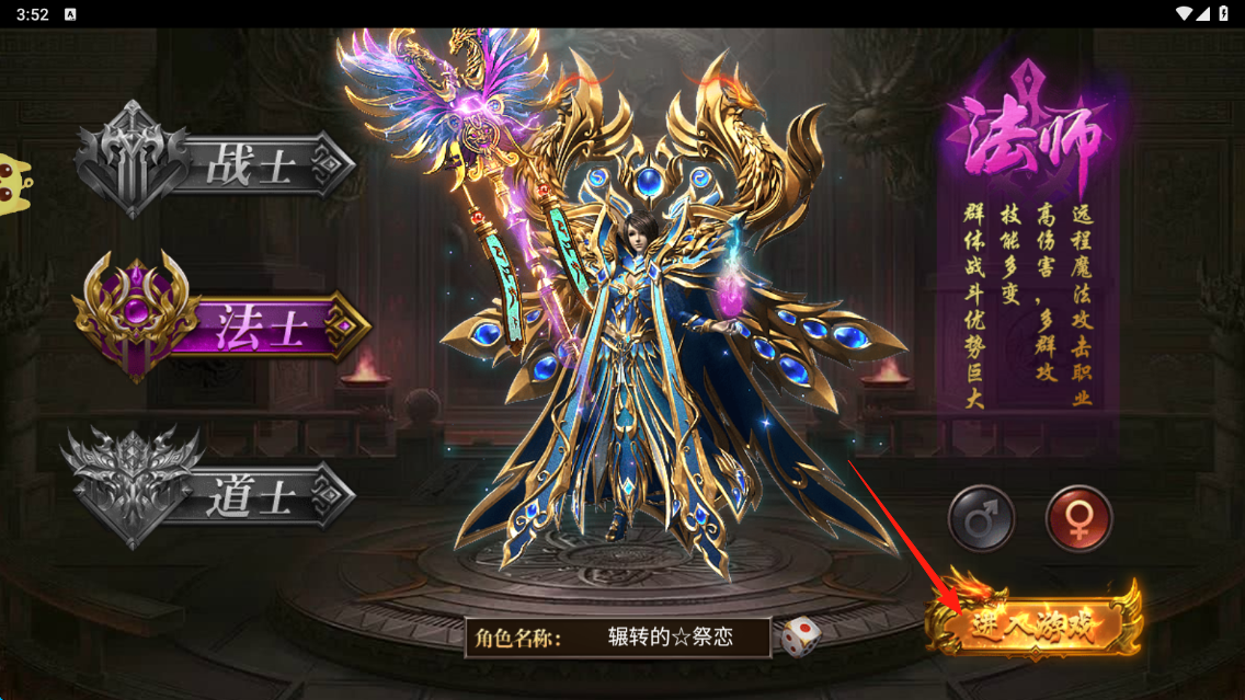 1、选法师职业,确定角色名,点进入,开启玛法大陆冒险之旅。