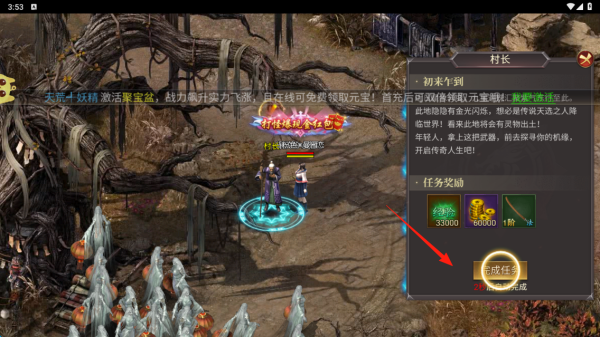 3、完成与村长对话任务,点完成,领经验金币武器,助力后续冒险。