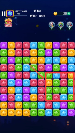 1、进入关卡后,观察星星分布,通过点击连接两个或以上同色星星进行消除,当连接越长,可获得的分数与奖励道具也越丰厚。