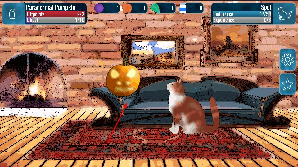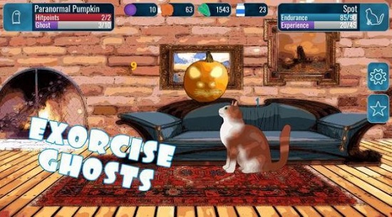 3、在冒险关卡中,滑动屏幕操控猫咪移动,当猫咪发现鬼魂时点击爪子图标驱赶,成功清除区域内所有鬼魂即可解锁下一神秘场景。