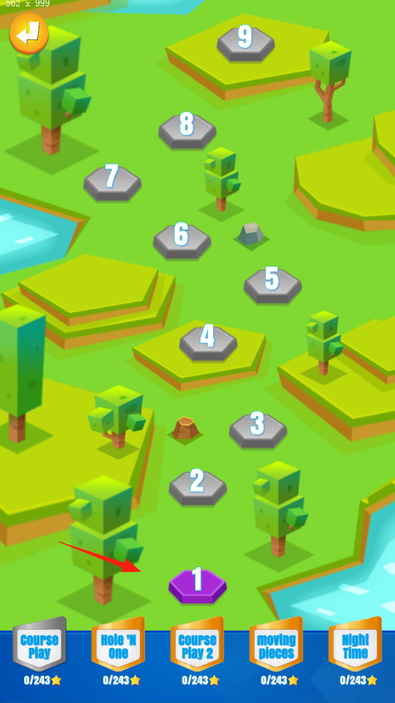 2、关卡地图选“1号洞开始,地图有9个洞,不同地形(树林、水域),点击紫色“1”进入该洞比赛。