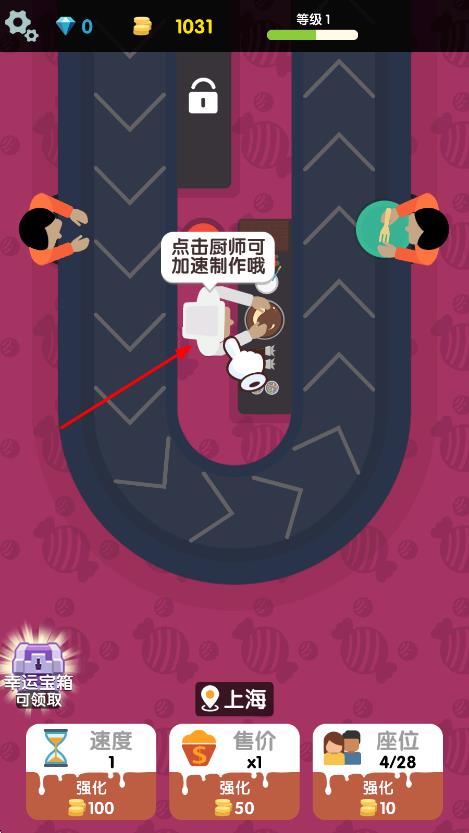 3、将制作好的甜点摆上回转传送轮供顾客挑选,根据订单需求调整甜点种类,赚取金币升级店铺设施。
