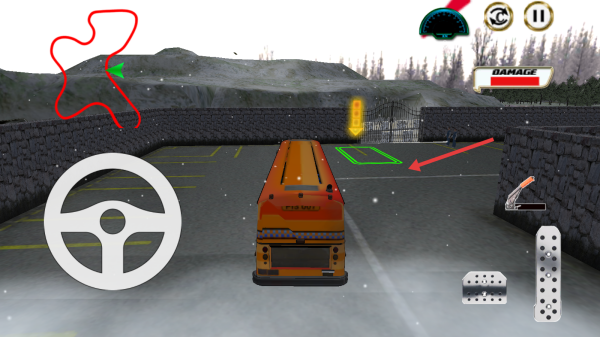 3、操控巴士,循着红色路线,精准驶入绿色停车区,顺利完成停车任务。