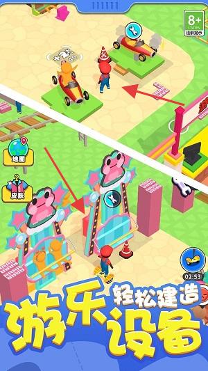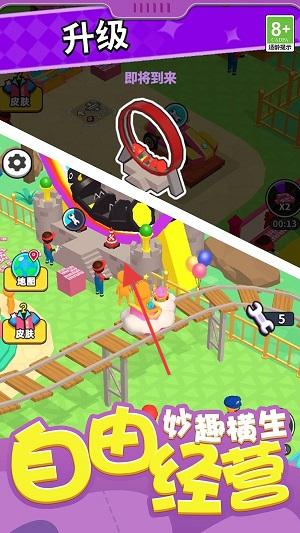 1、进入游戏,点击“升级”界面,消耗资源提升游乐设施等级,解锁新内容,丰富乐园体验。