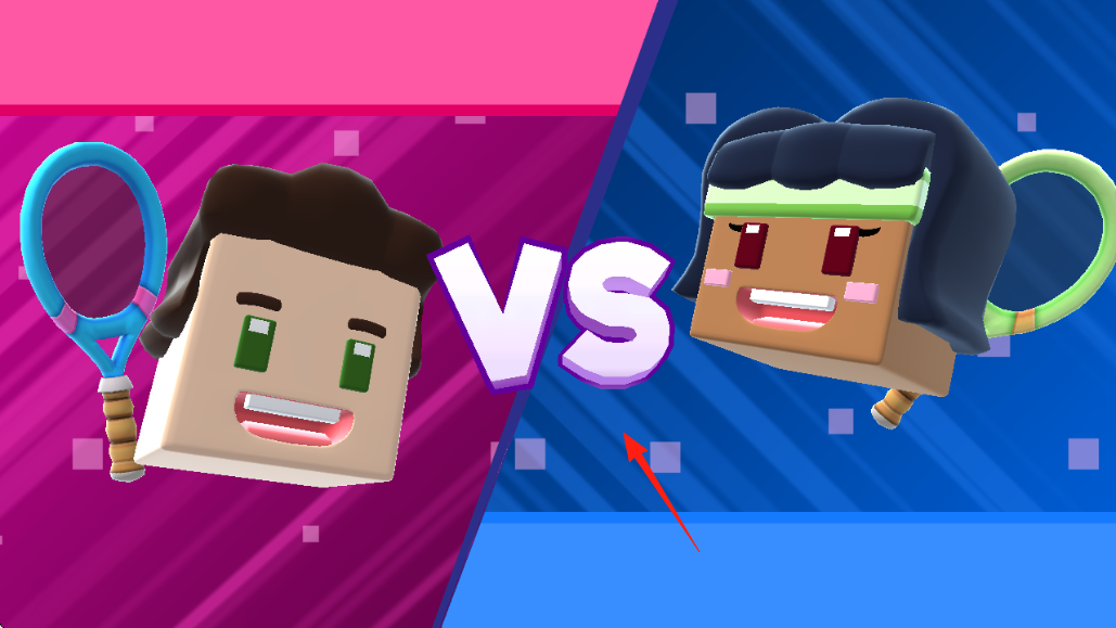 1、对战匹配匹配对手(男女角色),持网球拍,进入“VS”对决,场景分粉蓝两色,强化竞技氛围。