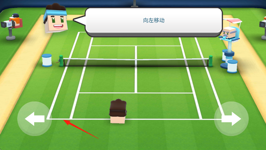 2、移动操作在绿色网球场,按提示“向左移动”,用左右箭头按键,控制角色跑位,准备接球。