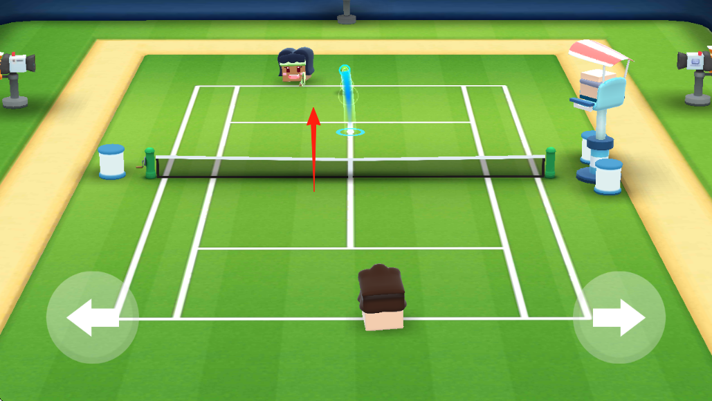 3、击球对抗预判球路(绿色轨迹),移动角色至落点,点击击球,与对手来回对打,争取得分。