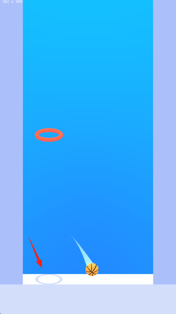 1、弹射操作滑动屏幕,控制篮球弹射轨迹(蓝线),穿过橙色圆环(得分区),调整角度、力度。