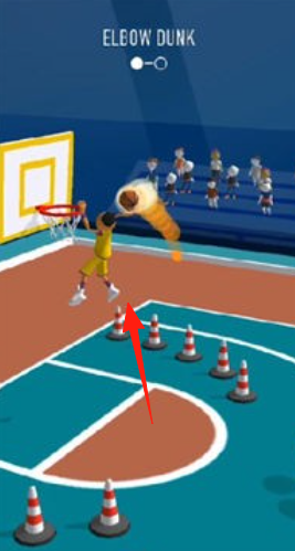 2、扣篮挑战在“ELBOWDUNK(手肘扣篮)”关卡,控制角色起跳,用特殊道具(巨型护肘),越过障碍,完成扣篮。