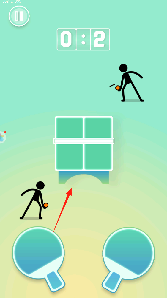 2、对战操作在限时(0:2)场景,控制球拍(左右按键),反弹乒乓球,避开中间方块障碍,与火柴人对手对打。