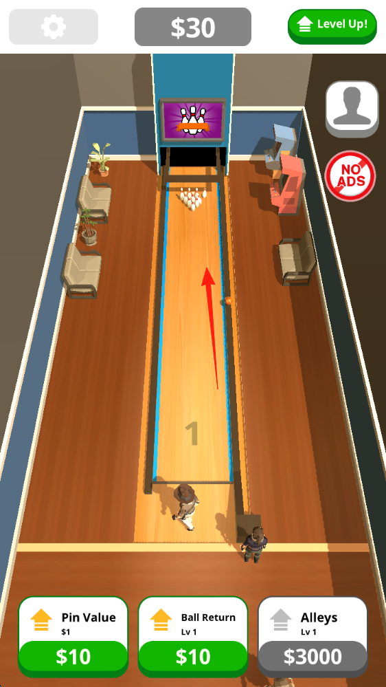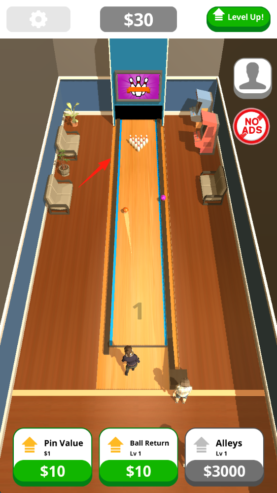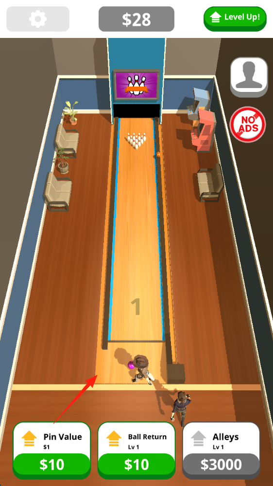 1、经营升级用金币($28→$30)升级“PinValue(球瓶价值)”“BallReturn(回球速度)”“Alleys(球道数量)”,提升场馆收益、体验。