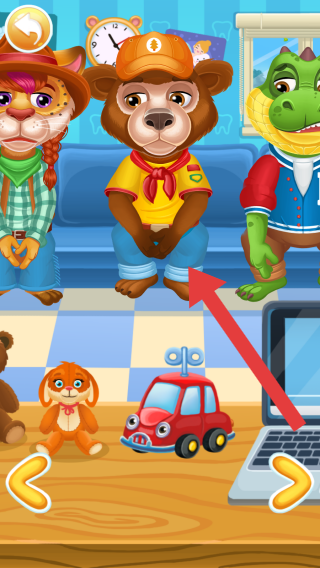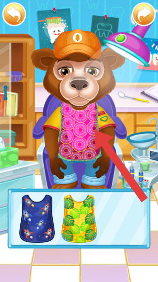 3、画面中是熊角色在牙科诊室,可进行服装(围裙)更换等装扮操作,体现角色扮演、装扮互动的玩法。