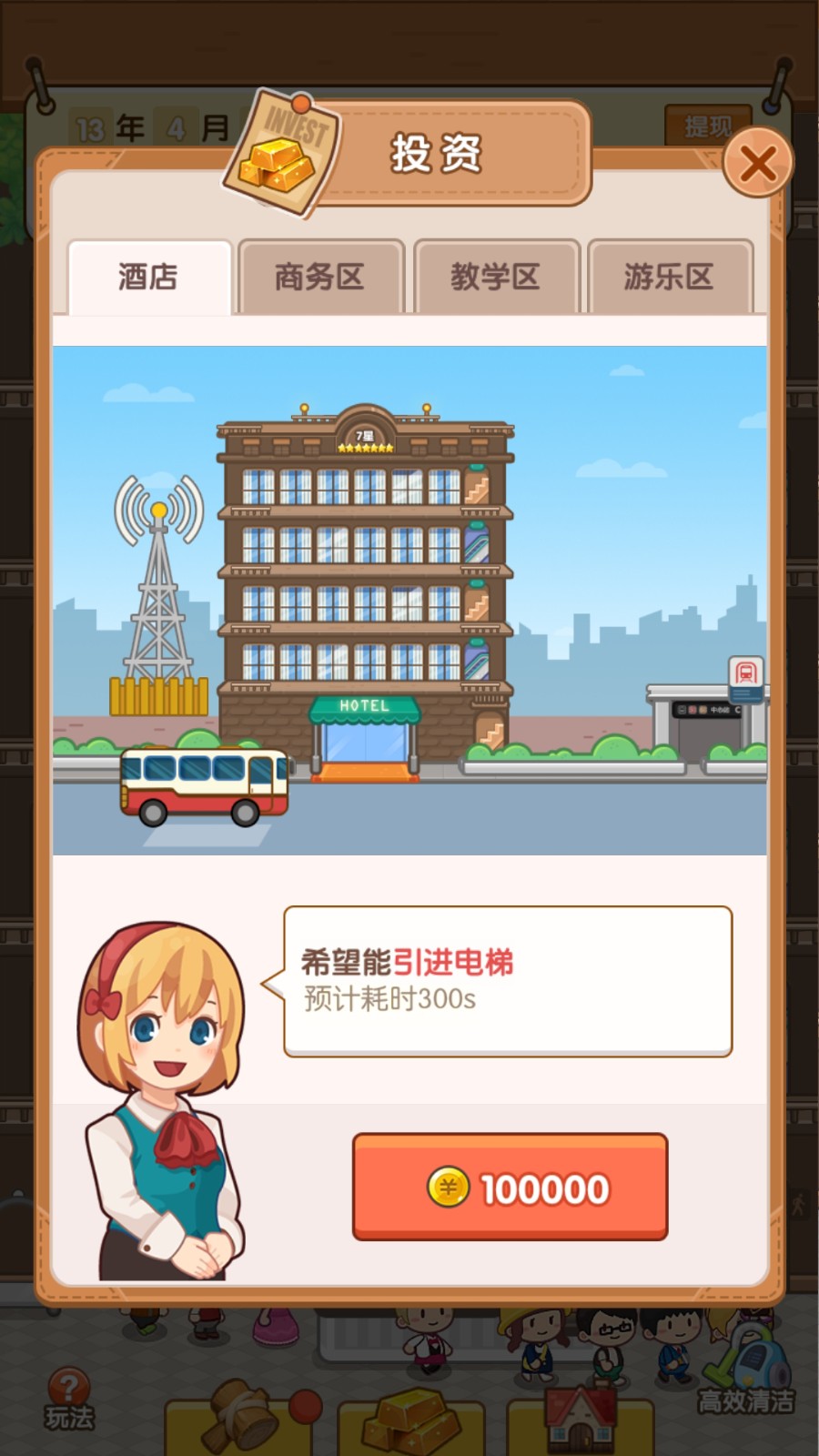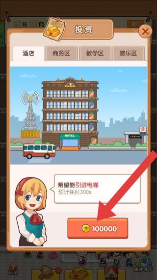 1、呈现“投资”界面,针对“酒店”建筑,需求是“引进电梯”,需花费100000金币,体现建筑升级、投资的玩法环节。