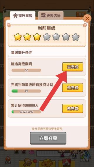 2、呈现“提升星级”界面,当前星级3星,显示“建造高级套间”“完成当前星级所有投资计划”“累计招待50000人”三个星级提升条件及进度,体现建筑星级升级的养成玩法。