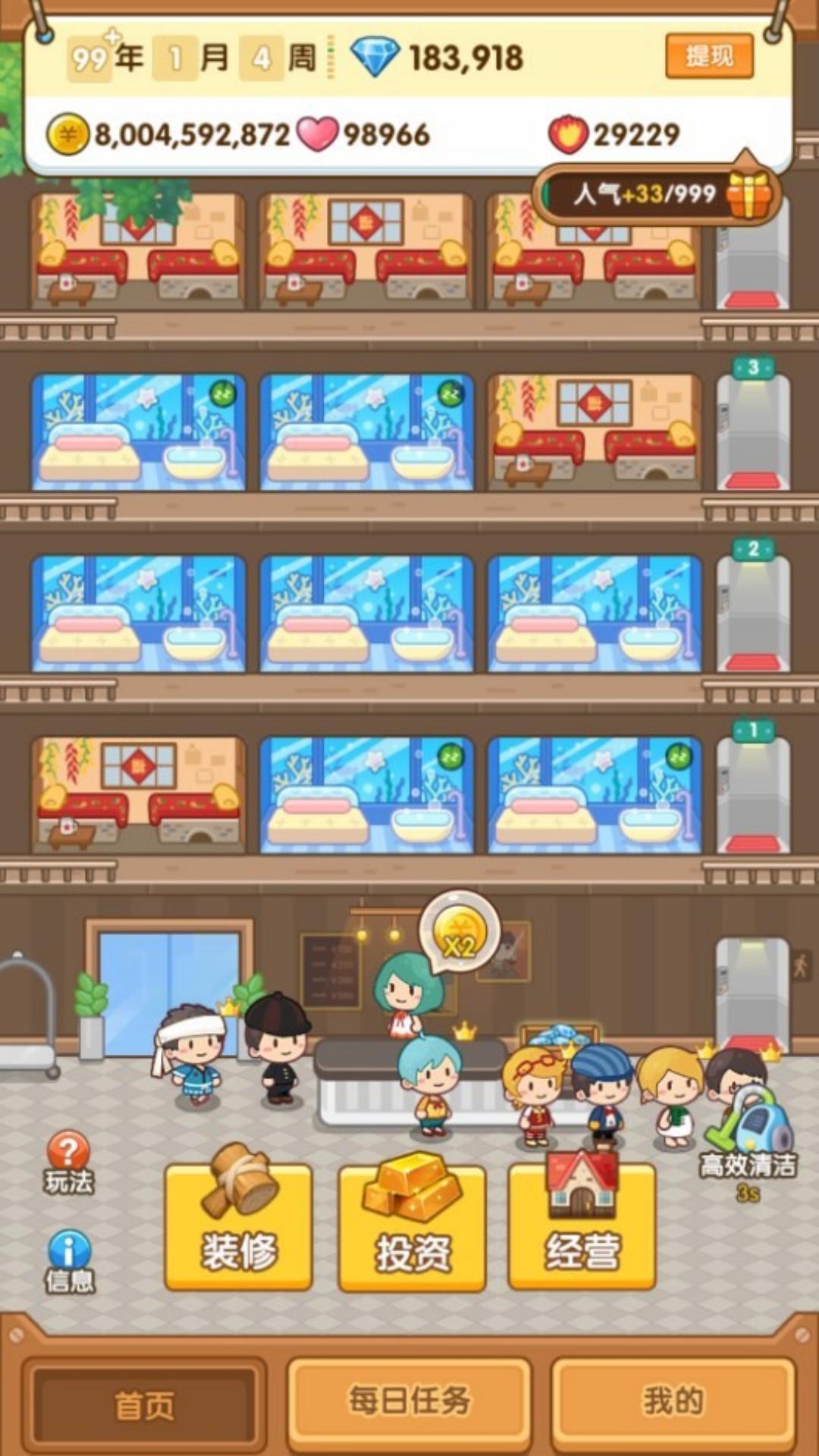 2、设施升级管理:解锁并升级酒店设施,打造舒适环境,满足顾客多样化需求,提升了酒店的竞争力。