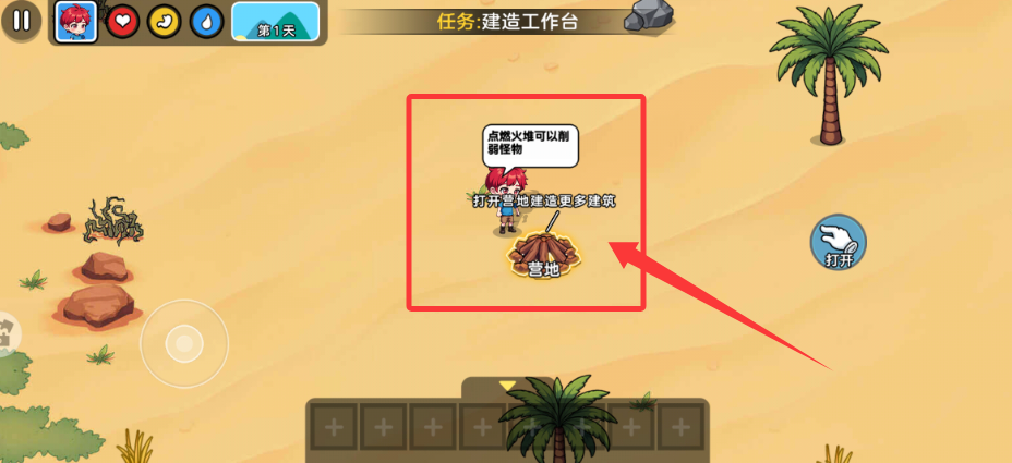 3、优先完成建造工作台任务,通过点燃火堆驱赶夜间怪物,确保生存基地安全建设。