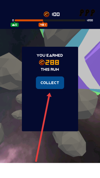 3、结束本轮,点击【COLLECT】(红箭头指向),领取288金币奖励,用于强化角色或解锁内容。