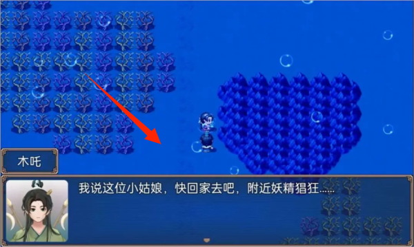 1、在海底场景移动,与木吒对话,留意妖精提示,探索区域完成互动。