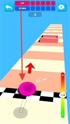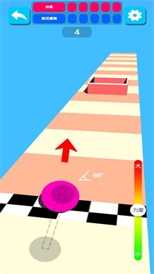3、在跑道关卡,调整力度、角度,点击粉色按钮发射小球,让其沿箭头方向跳跃,通过障碍。