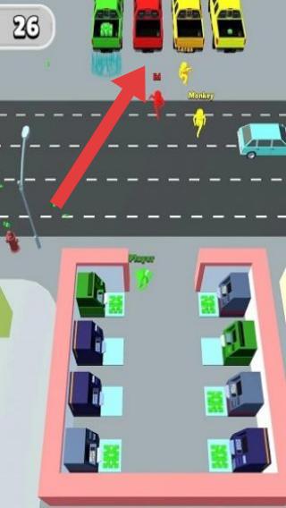 1、不同颜色小人(代表玩家及其他阵营)、车辆、建筑设施,呈现多人在城市道路场景中,通过吞噬等方式壮大己方人群的玩法特征。
