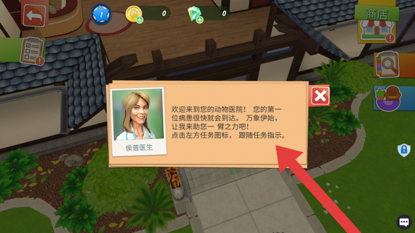 1、左上角返回箭头、资源显示(蓝球、金币、绿钻数量)、商店、任务提示等,呈现新手引导环节,告知玩家首位病患将至,引导点击左侧任务图标跟随指示。