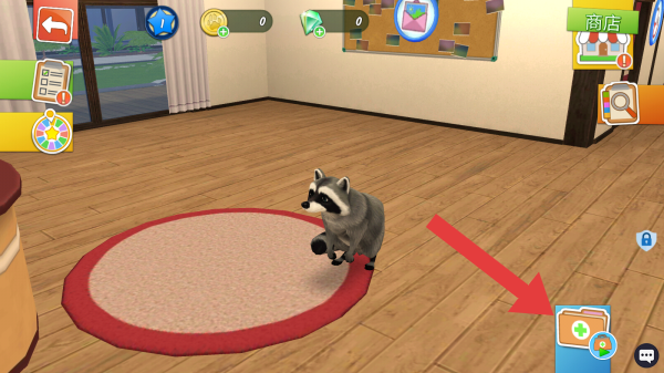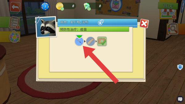 3、左上角返回箭头、资源显示(蓝球、金币、绿钻数量)、商店等,呈现宠物诊疗流程中的操作指引环节,红色箭头指向疫苗接种操作步骤相关图标。