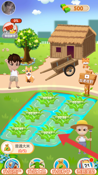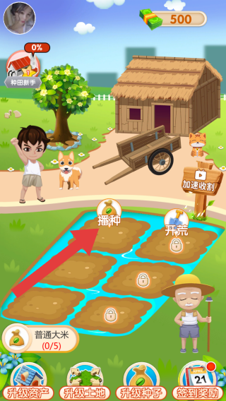 1、从界面元素(播种、开荒、升级资产等)及风格判断,是种田养成玩法,玩家可进行播种、经营农田等操作,通过完成任务获取奖励,推进农场发展。