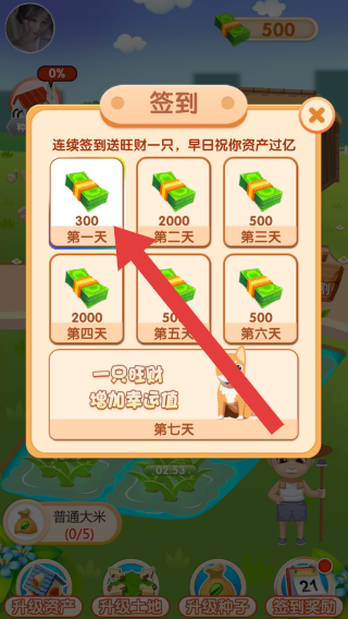3、显示连续签到奖励,第一天可领300货币,还有“连续签到送旺财一只,早日祝你资产过亿”等文字,用于激励玩家每日签到,获取奖励推进进程。