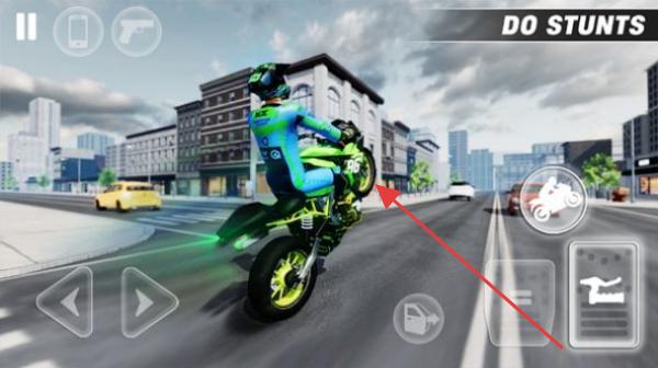 3、切换到摩托车,在【DO STUNTS】模式,使用特技按键,做出翘头等特技动作,推进游戏。