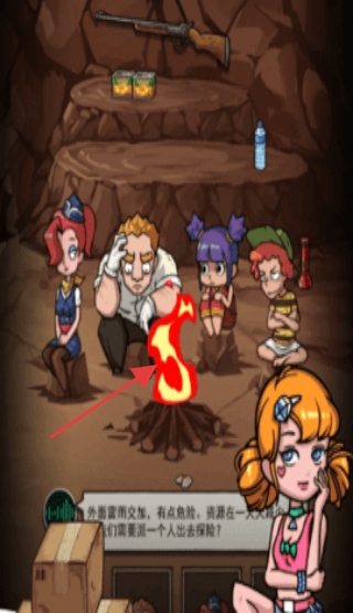 2、在山洞场景,关注【需要一个人出去探路】的讨论,选择角色参与探路。