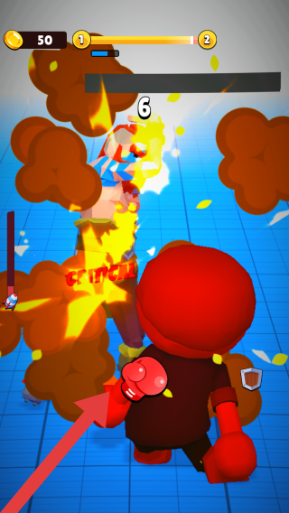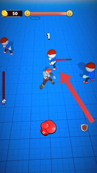 2、金币“50”、上方进度条(等级1-2)、数字“1”(是波数或敌人计数),呈现战斗场景,玩家角色与多个敌人在蓝色网格场地对战。