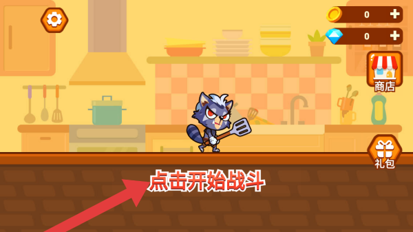 1、左上角设置按钮、金币、钻石、右侧“商店”“礼包”按钮、中间【点击开始战斗】文字,场景为厨房(有炉灶、锅碗、厨具等),呈现初始可点击开始战斗的界面。