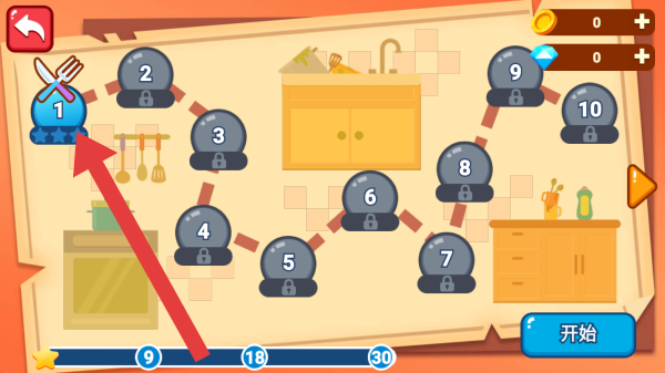 2、左上角返回按钮,带数字和锁标识的关卡,下方【开始】按钮,场景为厨房(有炉灶、橱柜、厨具等),呈现关卡地图,可选择关卡1进入。