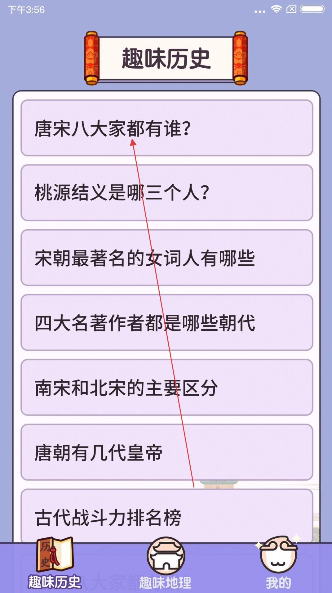 2、切换“趣味历史”,选问题(如唐宋八大家),作答,了解历史文化内容。